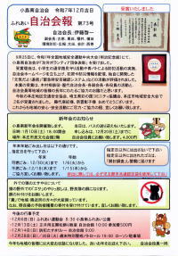 令和7年度事業報告 令和8年度事業計画を 掲載しました。 ご覧ください。 防災マニュアルブック 【家庭での備えに活用】 ![]() 家庭で取り入れやすい備えをまとめたリーフレットです。家庭での備え、地域での防災の取組などで活用してください。埼玉県のホームページにリンクしてあります。ご活用下さい。 旭地区自治会長会・東日本大震災南相馬市災害避難者との交流・研修報告 ![]() 静岡県三島市での視察研修報告について ![]() はにぽんお口の健康体操 本庄市児玉郡歯科医師会の お勧めの体操です。 雨の日の小島南 本庄ドローンクラブ空撮 電子回覧板 ![]() 連絡網 ![]() 元気だよ!通信 ![]() 緊急安否確認システム ![]() 本庄市警戒レベル3発令時に活用 ![]() 緊急安否確認アプリ紹介動画です ![]() 安心・安全マップ ![]() ![]()