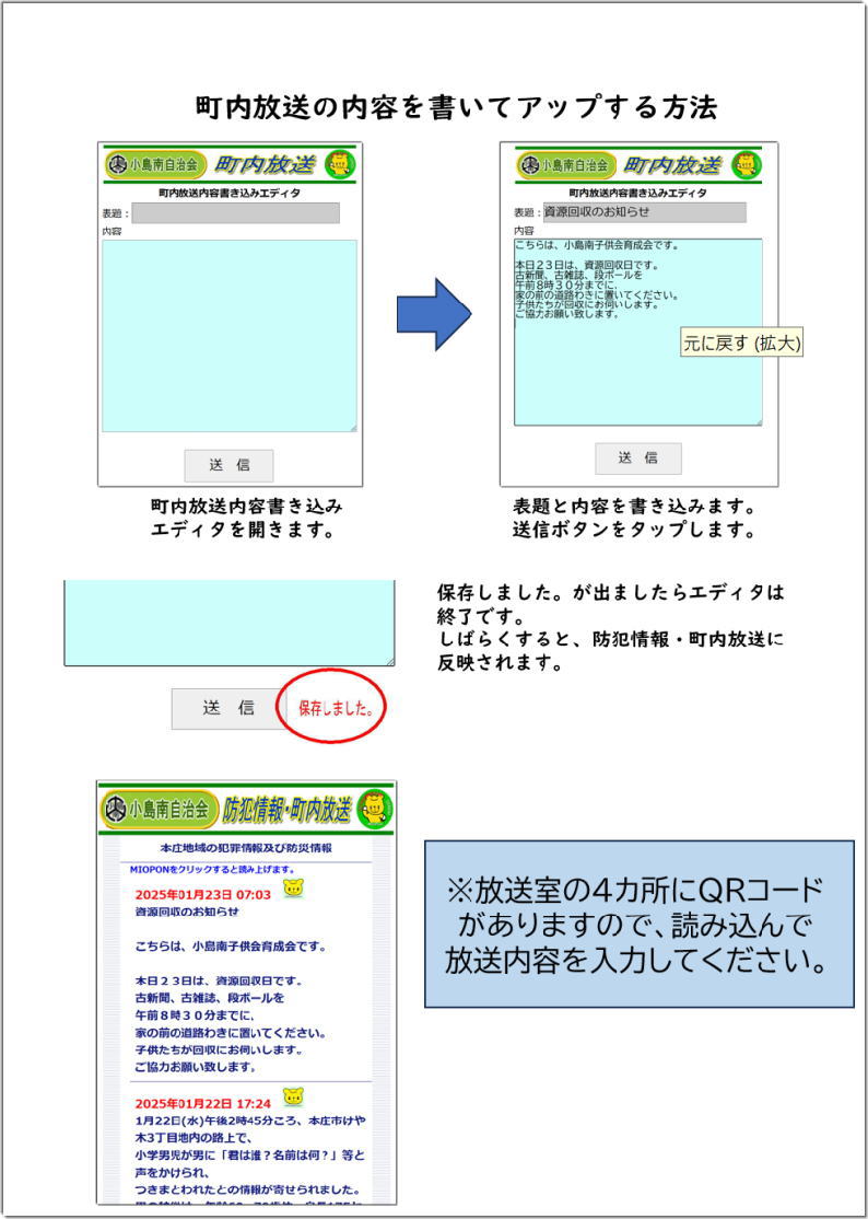令和6年度事業報告 令和7年度事業計画を 掲載しました。 ご覧ください。 ![]() ![]() 防災マニュアルブック 【家庭での備えに活用】 ![]() 家庭で取り入れやすい備えをまとめたリーフレットです。家庭での備え、地域での防災の取組などで活用してください。埼玉県のホームページにリンクしてあります。ご活用下さい。 旭地区自治会長会・東日本大震災南相馬市災害避難者との交流・研修報告 ![]() 静岡県三島市での視察研修報告について ![]() はにぽんお口の健康体操 本庄市児玉郡歯科医師会の お勧めの体操です。 雨の日の小島南 本庄ドローンクラブ空撮 電子回覧板 ![]() 連絡網 ![]() 元気だよ!通信 ![]() 緊急安否確認システム ![]() 本庄市警戒レベル3発令時に活用 ![]() 緊急安否確認アプリ紹介動画です ![]() 安心・安全マップ ![]() ![]() ![]() | ![]() ![]() ![]() ![]() ![]() ![]() ![]() |